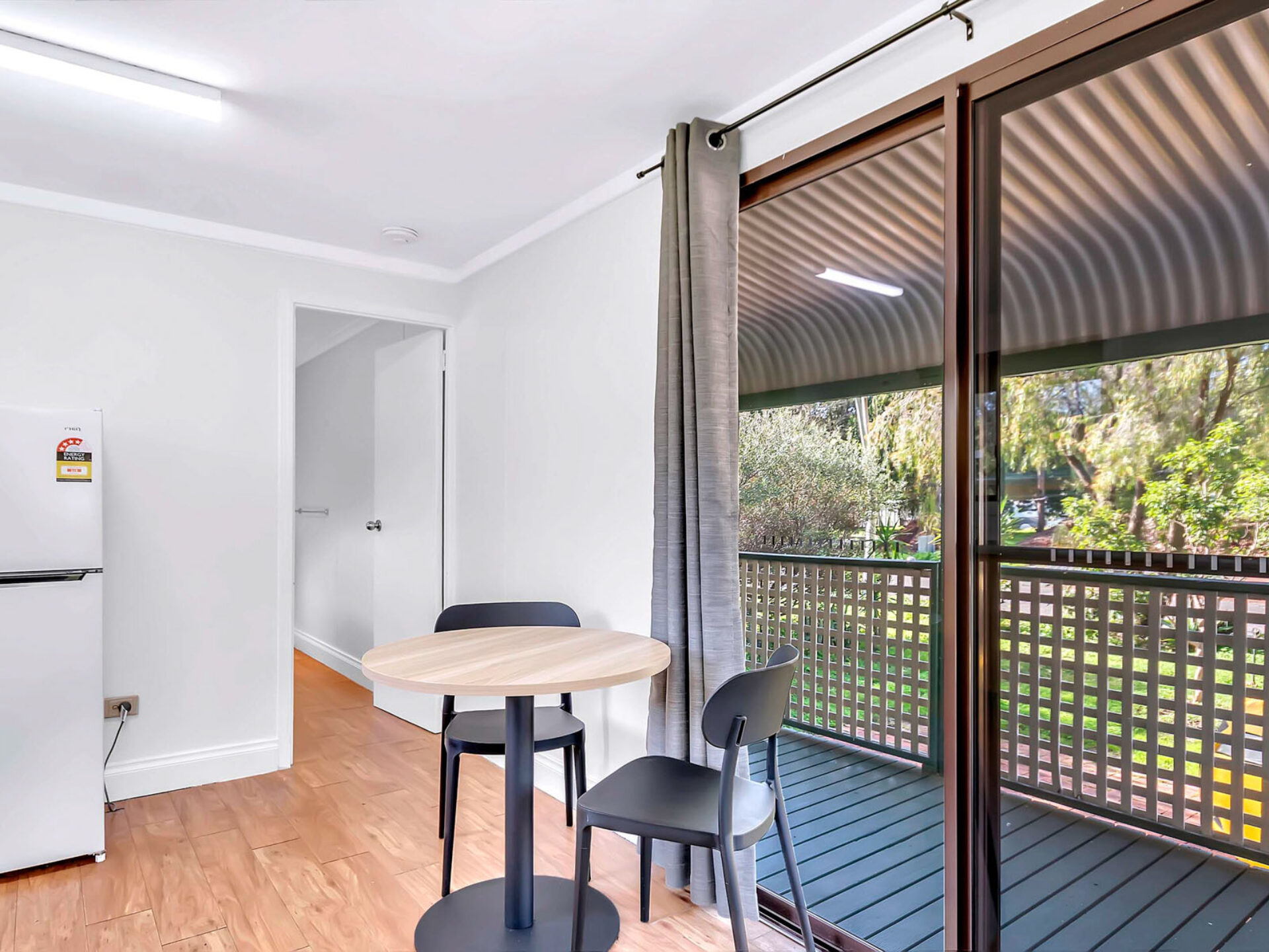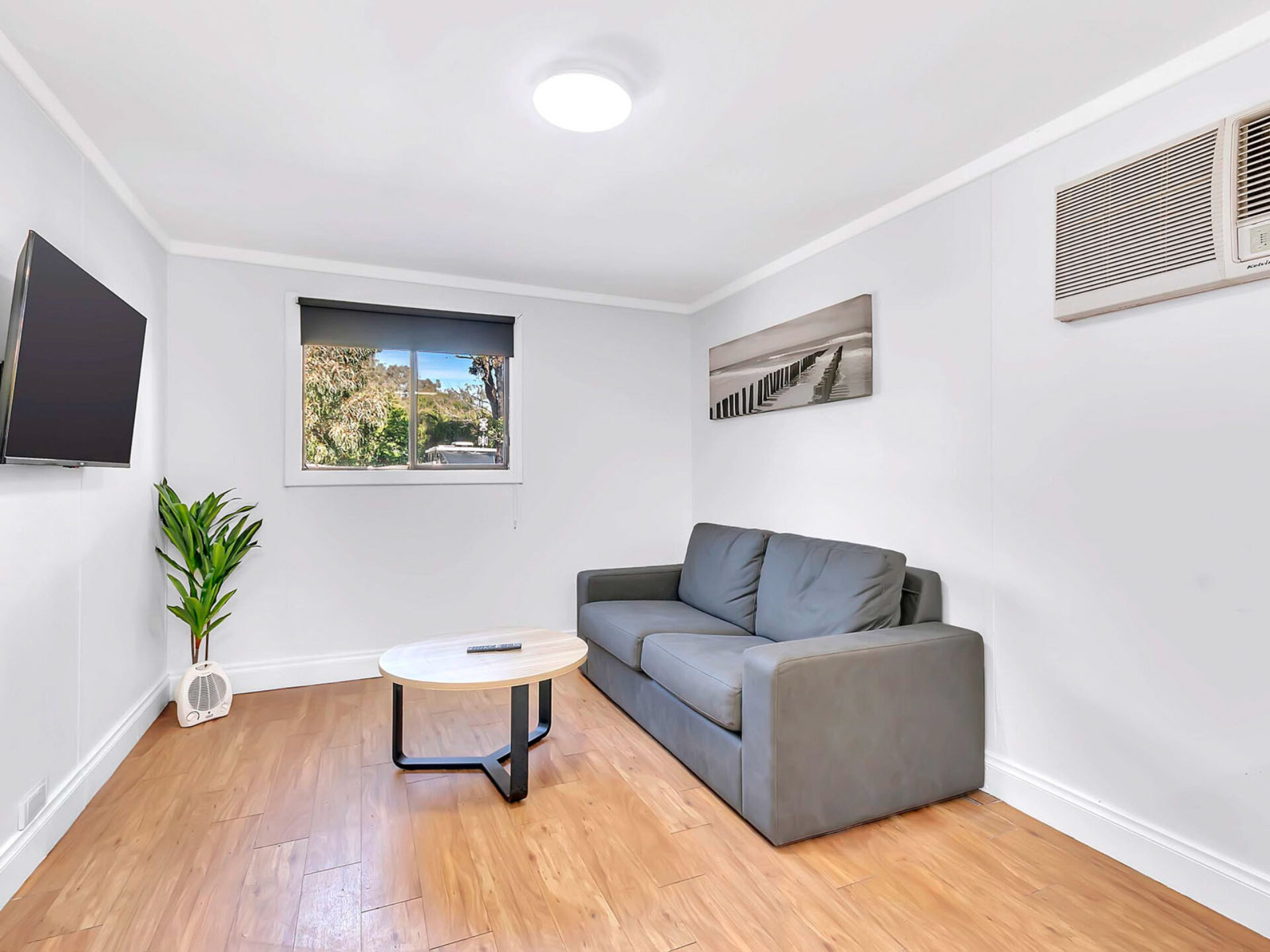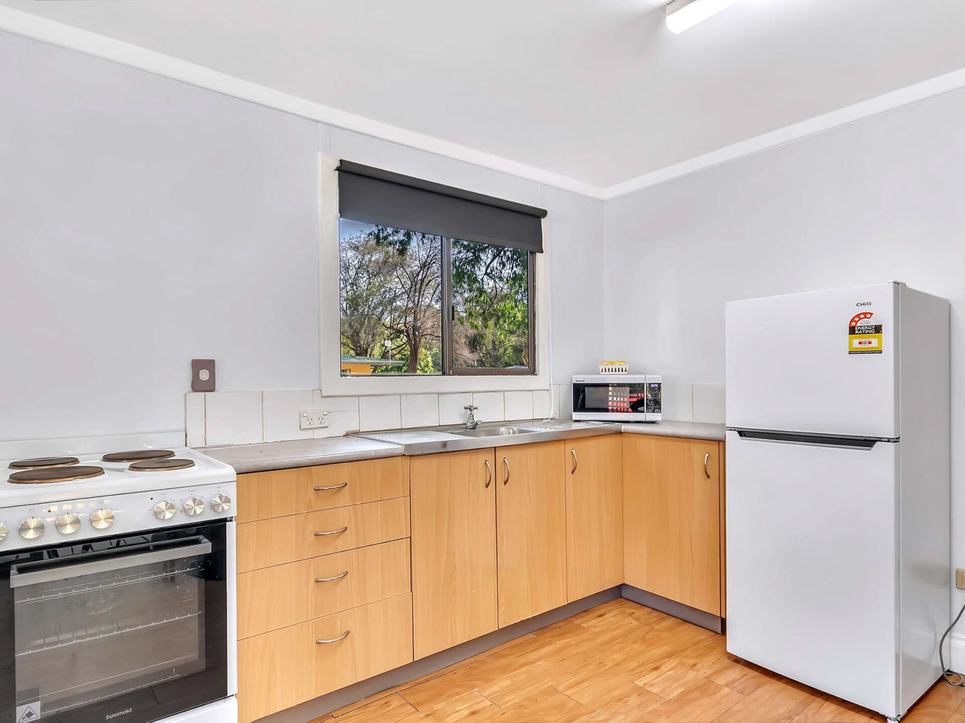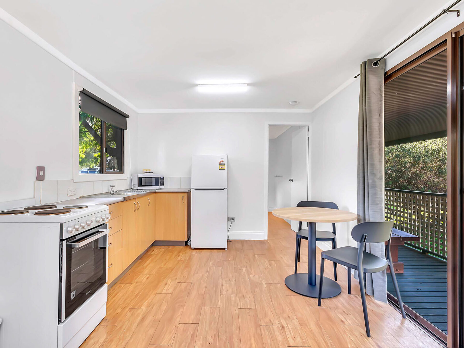 This one-bedroom cabin sleeps two guests in a double bed and includes a separate living area. The kitchenette features an electric oven, stovetop, microwave, and full-size fridge. Air-conditioning is provided in both rooms. Guests have access to nearby shared bathroom facilities, as the cabin does not include a private bathroom.