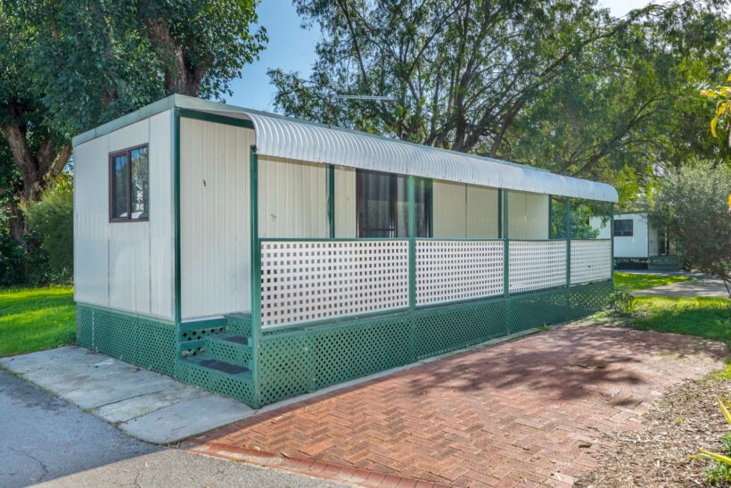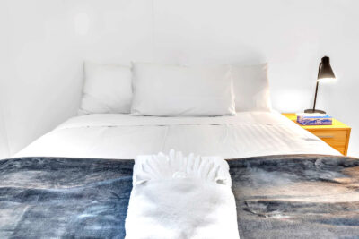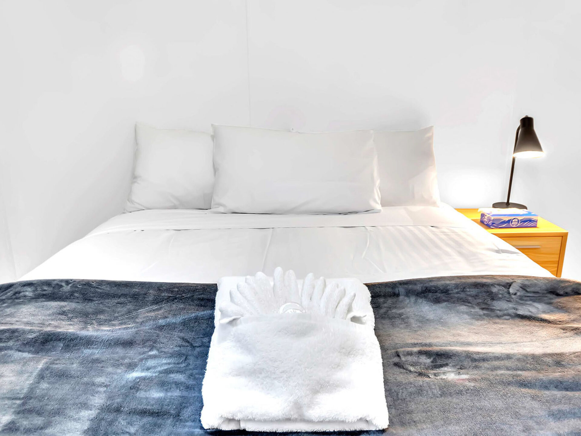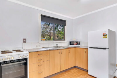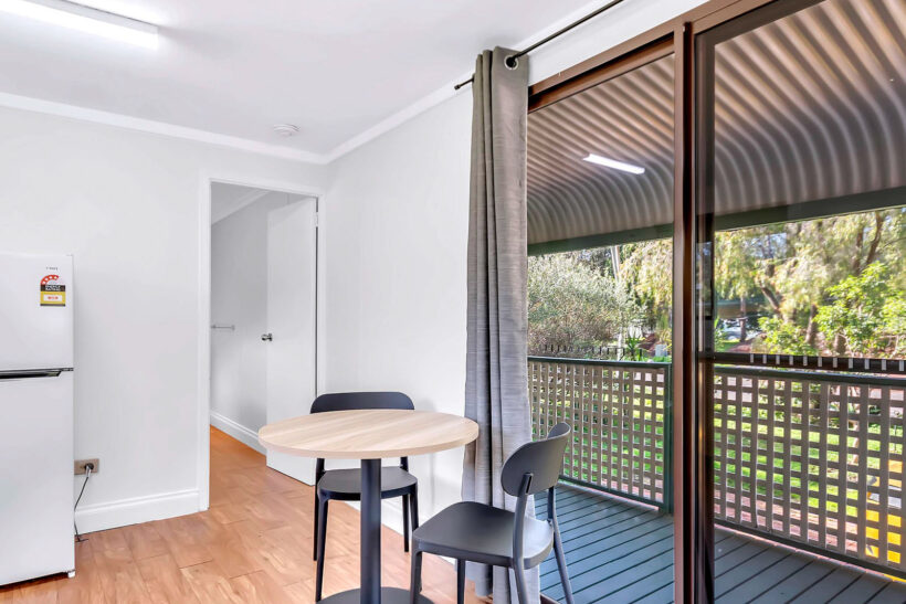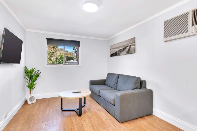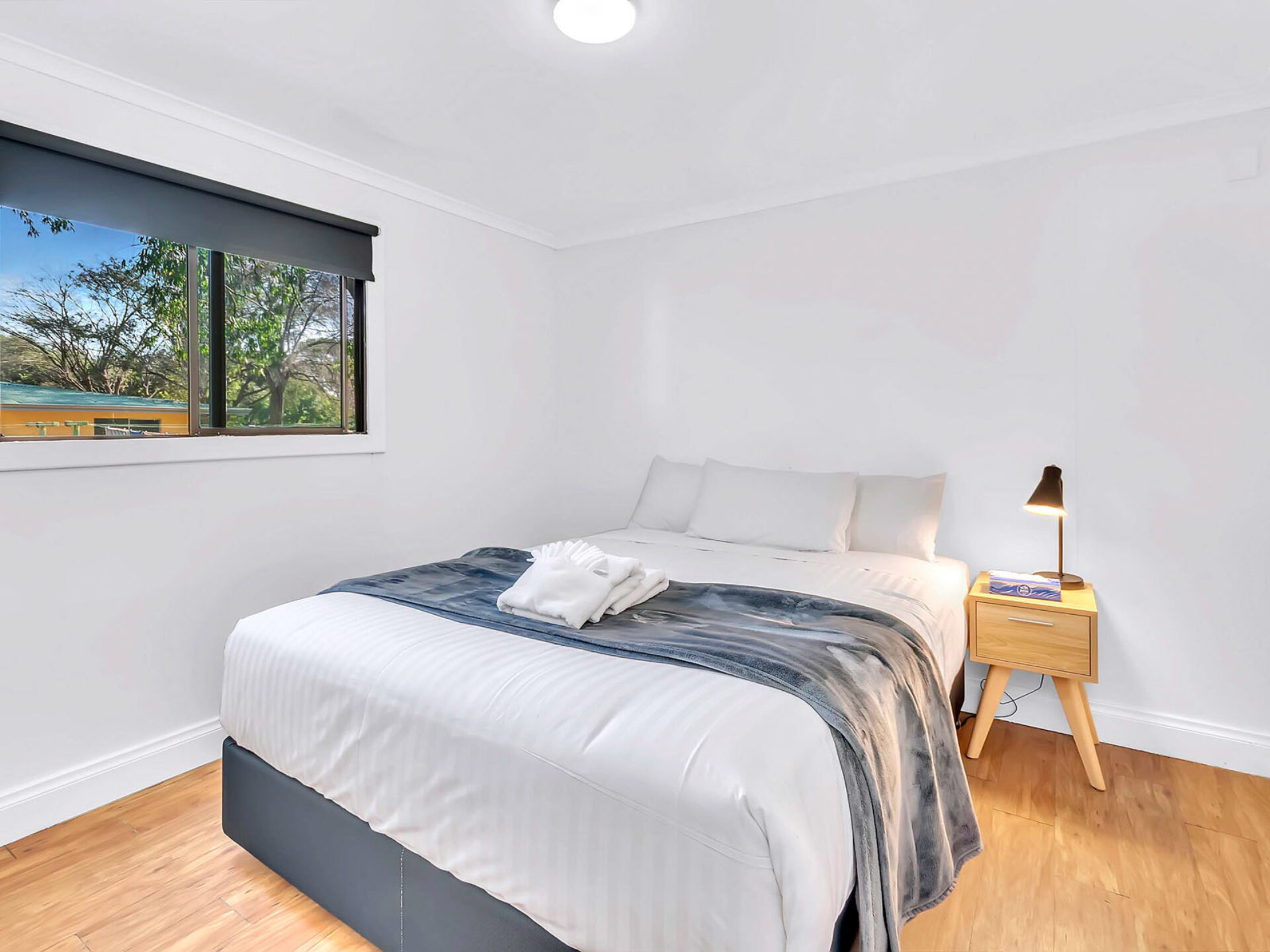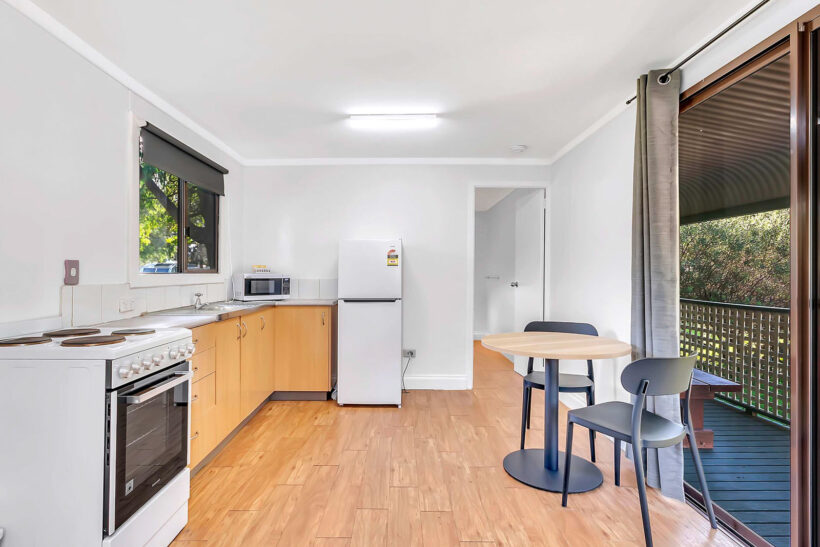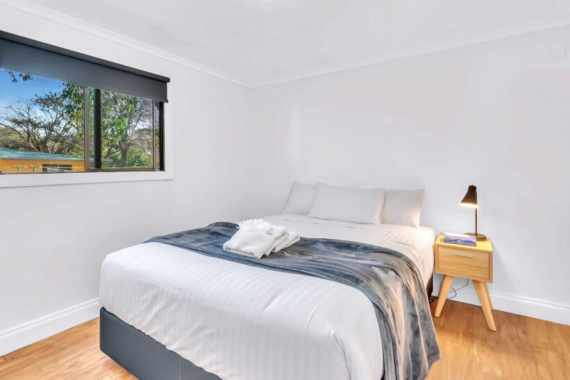This one-bedroom cabin sleeps two guests in a double bed and includes a separate living area. The kitchenette features an electric oven, stovetop, microwave, and full-size fridge. Air-conditioning is provided in both rooms. Guests have access to nearby shared bathroom facilities, as the cabin does not include a private bathroom.